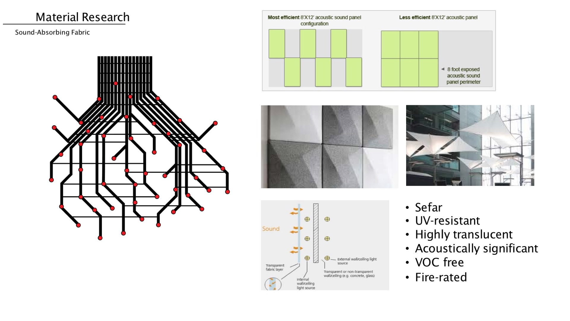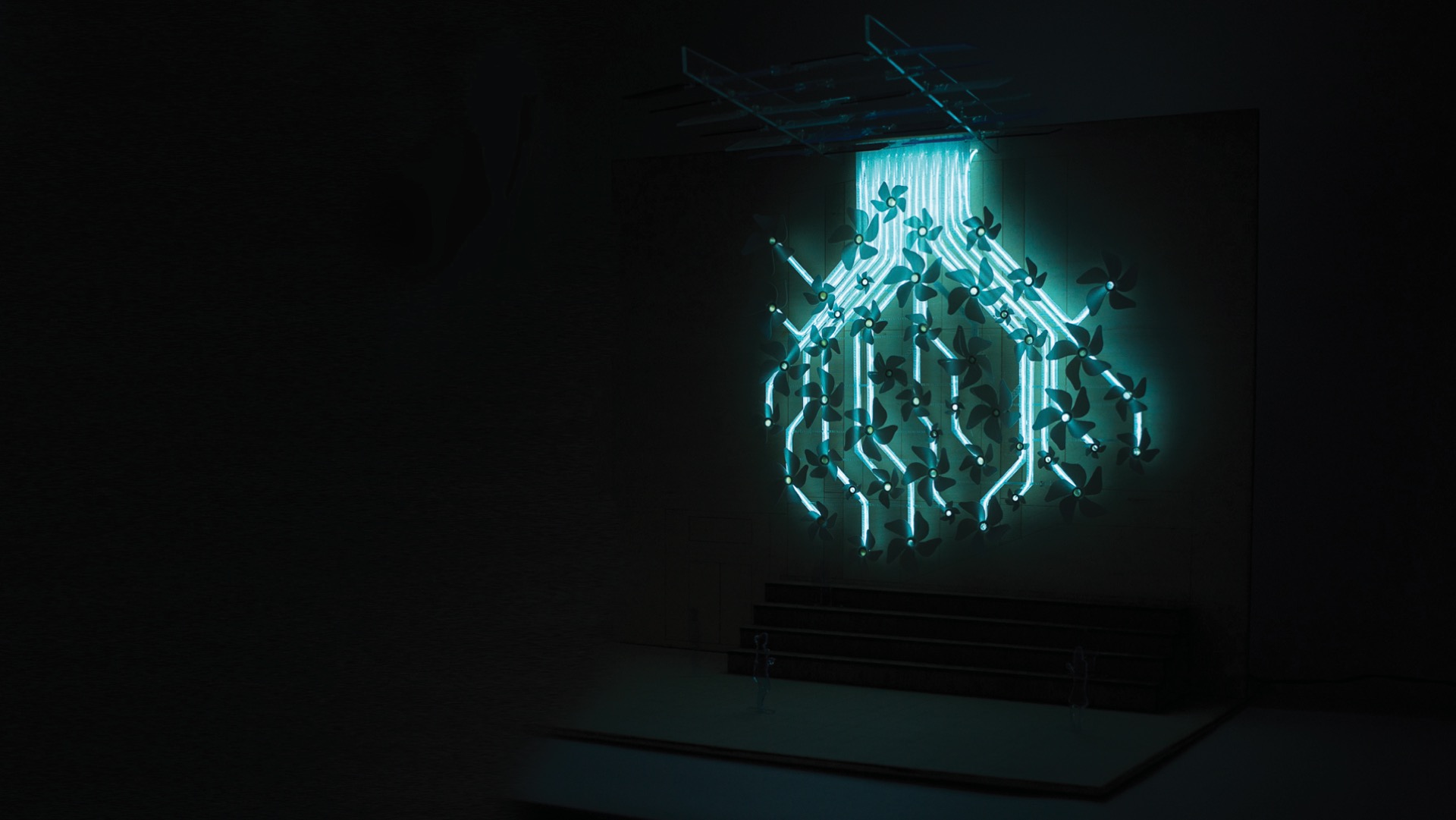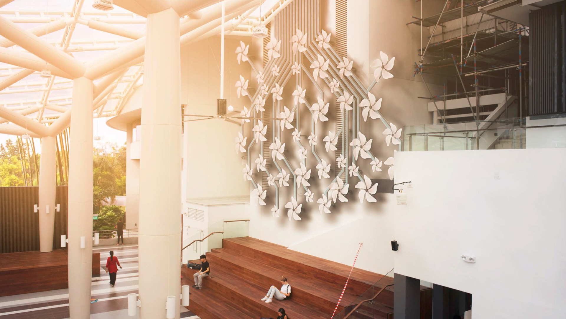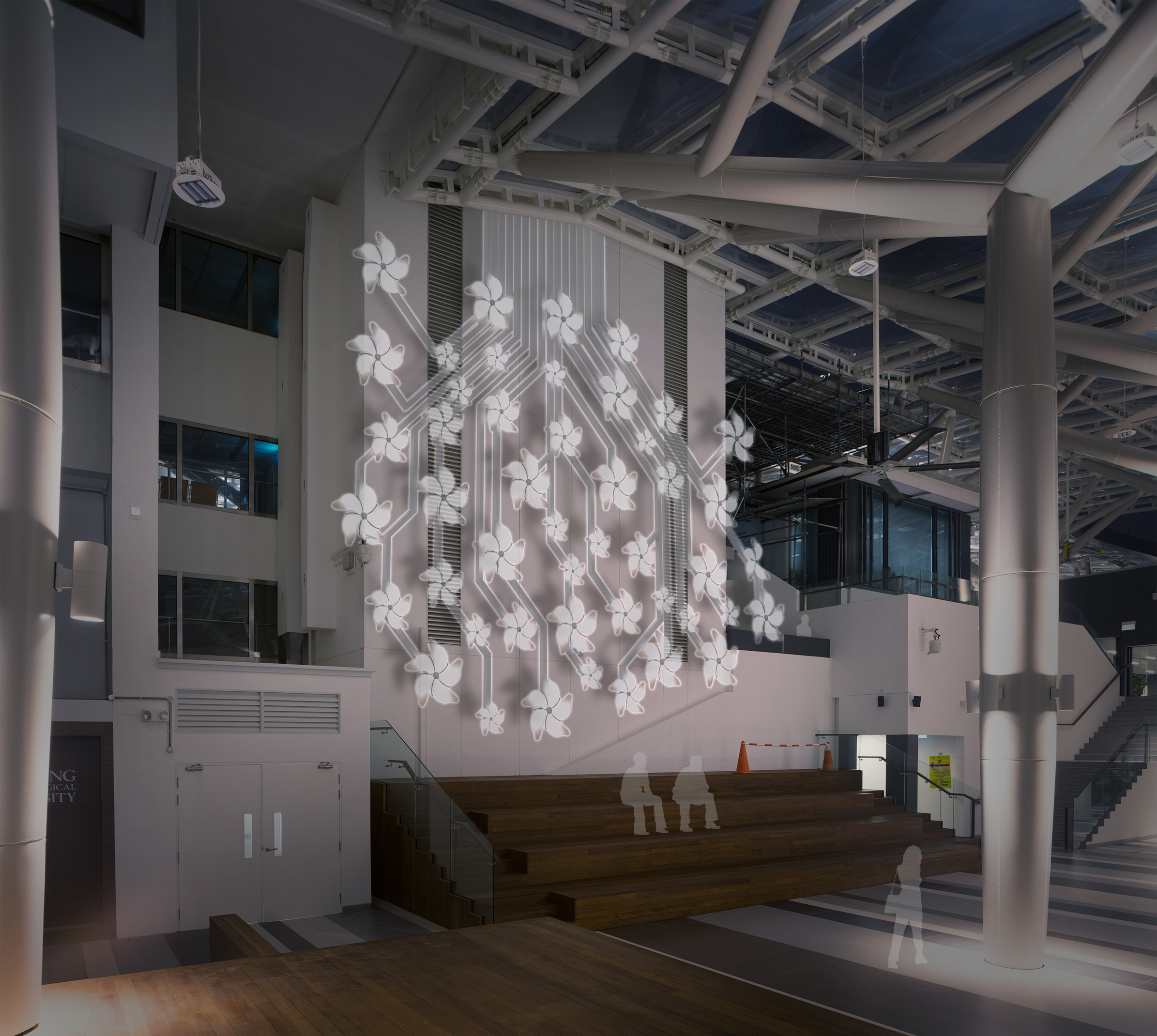 Bloom draws a visual connection between solar harvesting and the clear benefits it has for people on all levels of society. The solar leaves are translucent solar cells that filter coloured light through to the space below — this encourages people in the space to look up at the entirety of the piece. The flower-esque sculptures respond to people in the space below by “breathing”— the petals flex using shape-memory alloy wires (which allows the sculpture to be lightweight). The flowers and connecting vines glow using electro-luminescent film; which has low weight and low power consumption. To improve the quality of presentations and interactions in the space (and to reduce the harsh echoes), the petals are covered in a sound-diffusing fabric.